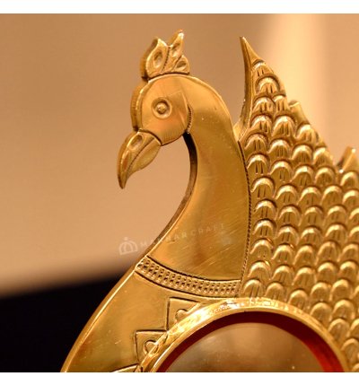 Beautiful Peacock Model Aranmula Kannadi with back stand, handcrafted in Kerala. This 2.5-inch authentic metal mirror symbolizes tradition, prosperity, and timeless craftsmanship.