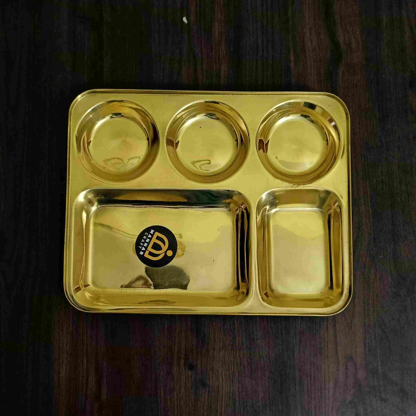 Elegant polished brass dinner plate with extra-deep round compartments — a traditional serving thali perfect for festive and daily dining.