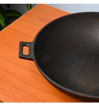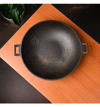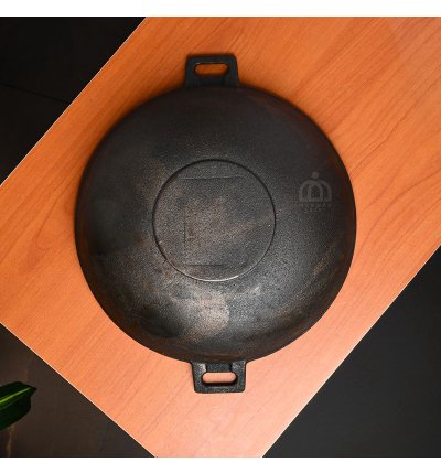 Handcrafted 12-inch pre-seasoned cast iron wok kadai with fine finish and small handles for easy grip. Durable and heavy-duty, perfect for deep frying, sautéing, and traditional cooking at home or in restaurants.