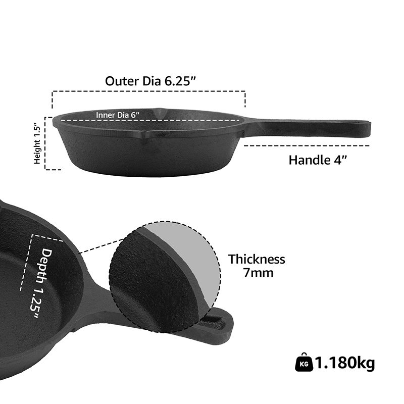 Cook healthy and delicious meals with this Pre-Seasoned 6 Inch Cast Iron Skillet. Perfect for frying, sautéing, baking, and roasting. Compatible with gas stove, induction, and oven — this durable, toxin-free skillet ensures even heat distribution.