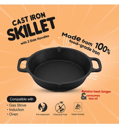 Enjoy versatile cooking with this Pre-Seasoned Cast Iron Skillet featuring two sturdy side handles for easy grip and handling. Perfect for frying, sautéing, baking, and roasting, it works seamlessly on gas stoves, induction, and ovens.