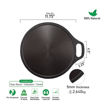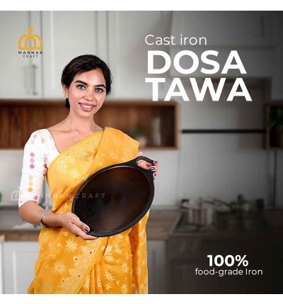 - Premium Cast Iron: Our Dosa Tawa is constructed from high-quality cast iron, known for its superior heat retention and even cooking, ensuring your dishes are cooked to perfection.