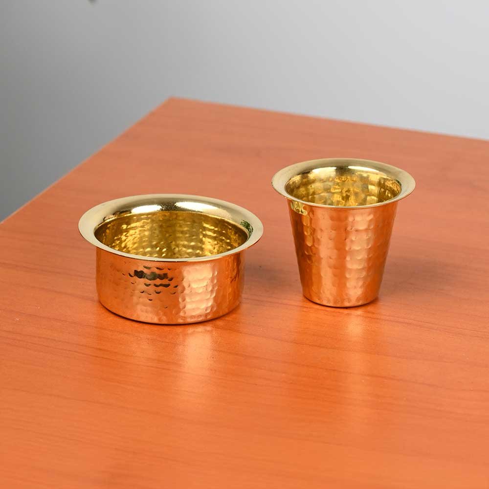 Enhance your coffee experience with our Premium Brass Hammered Matte Finish Coffee Dabra Set. Designed for lovers of traditional South Indian filter coffee, this elegant set includes a tumbler and davara (dabara), perfect for serving rich, aromatic brews. Crafted from high-quality brass, the matte finish and hand-hammered texture add a touch of sophistication to your coffee rituals. Ideal for serving both coffee and tea, this 200ml set brings an authentic heritage charm to every sip.