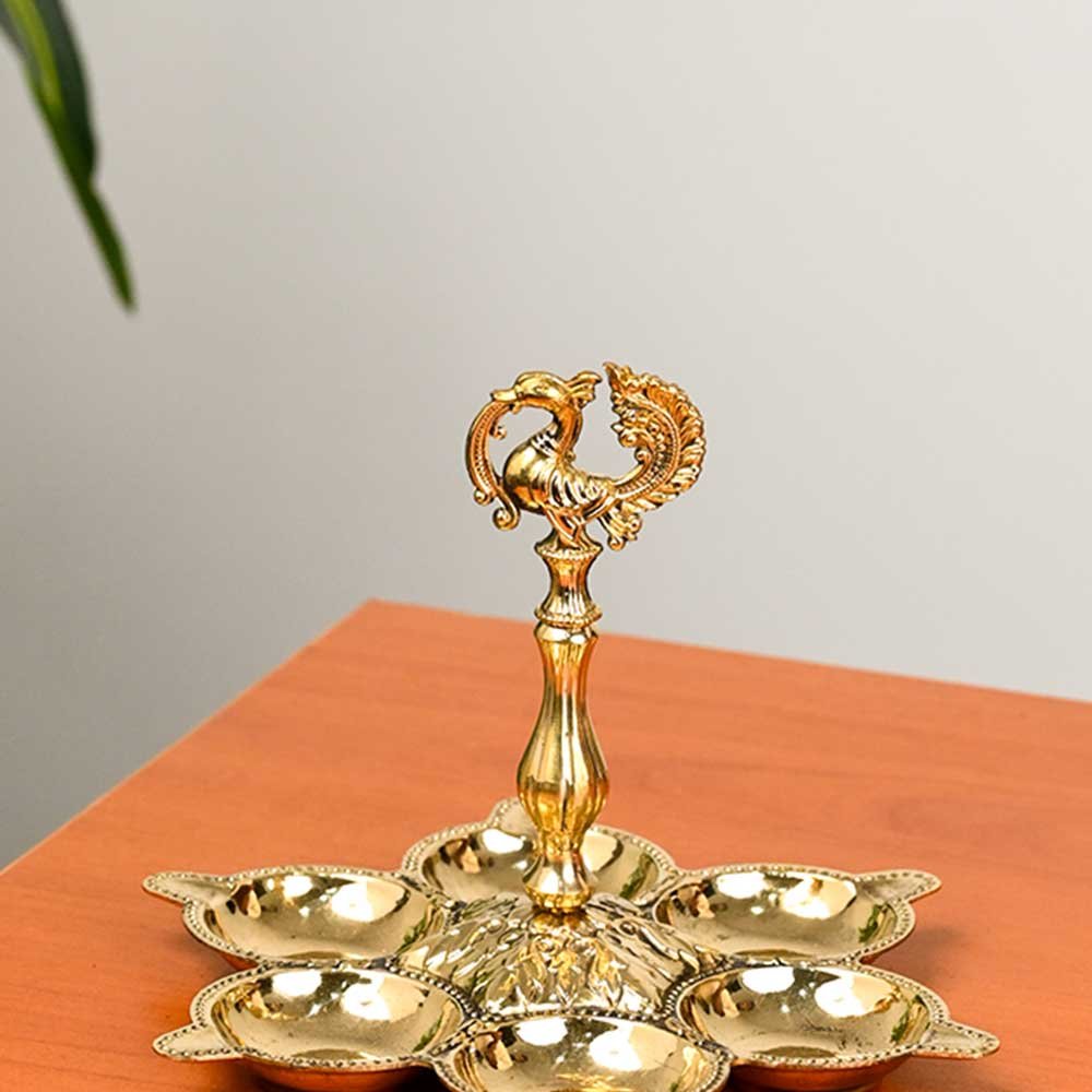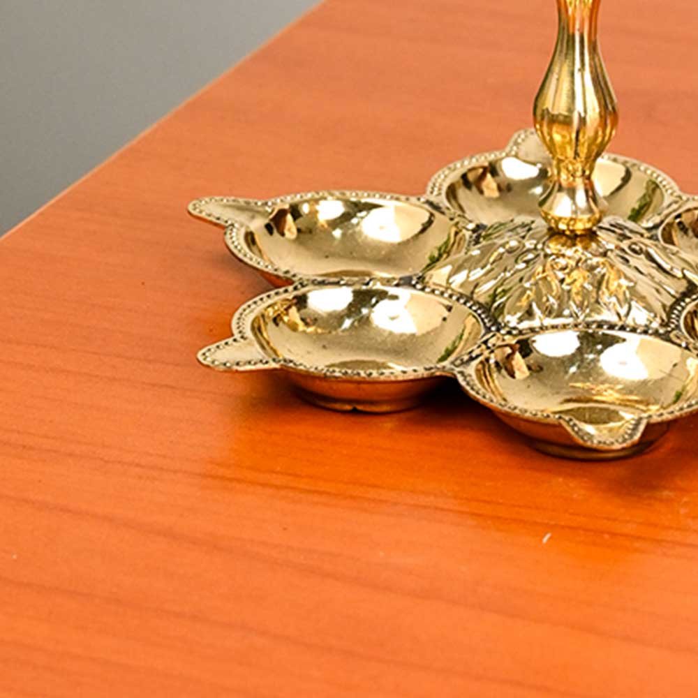 Crafted from solid brass, this lamp embodies purity and auspiciousness — perfect for temples, home shrines, and festive occasions such as Diwali, Navratri, and Karthigai Deepam. Each of the six wicks signifies divine illumination and spiritual awakening, making it a sacred centerpiece for rituals and prayer ceremonies.