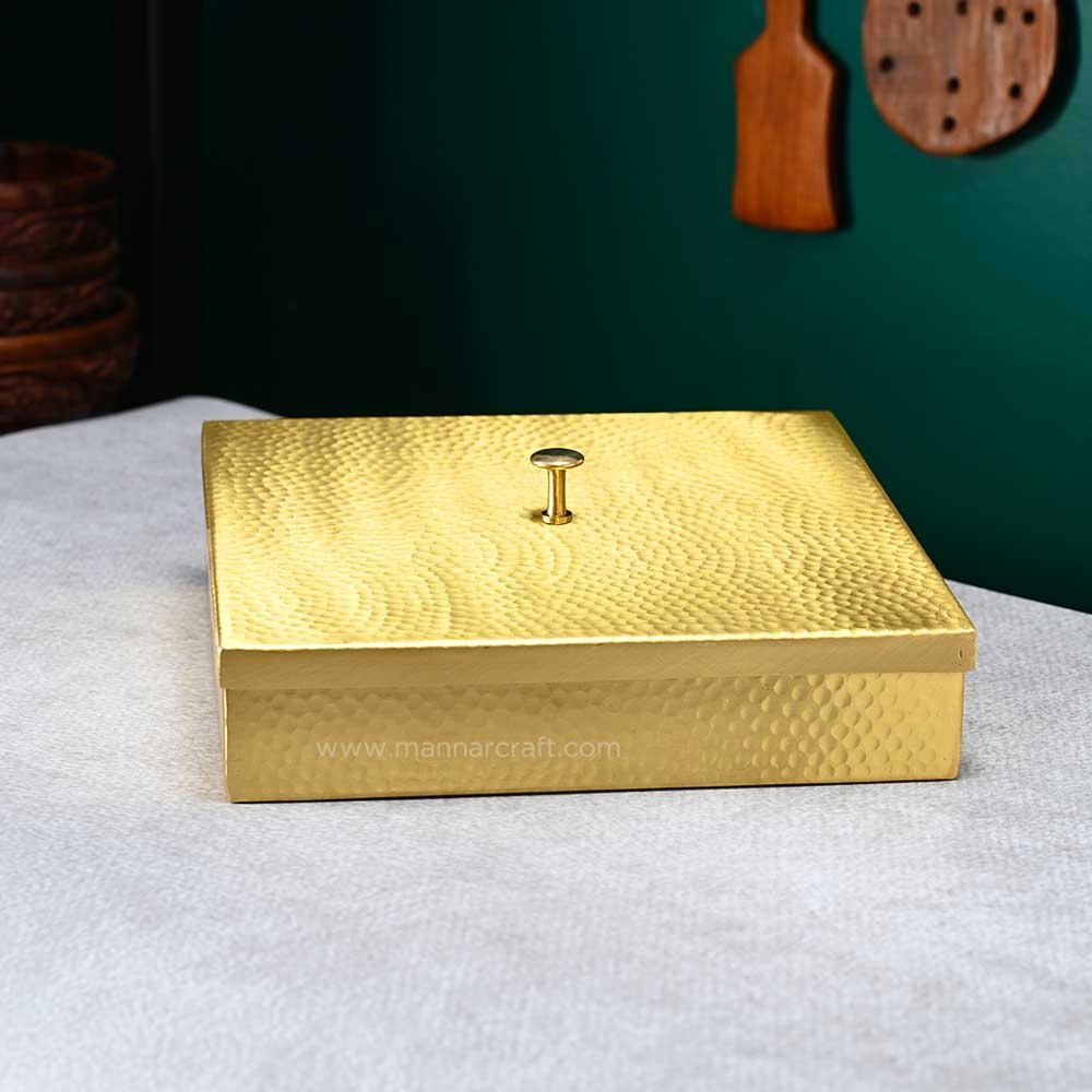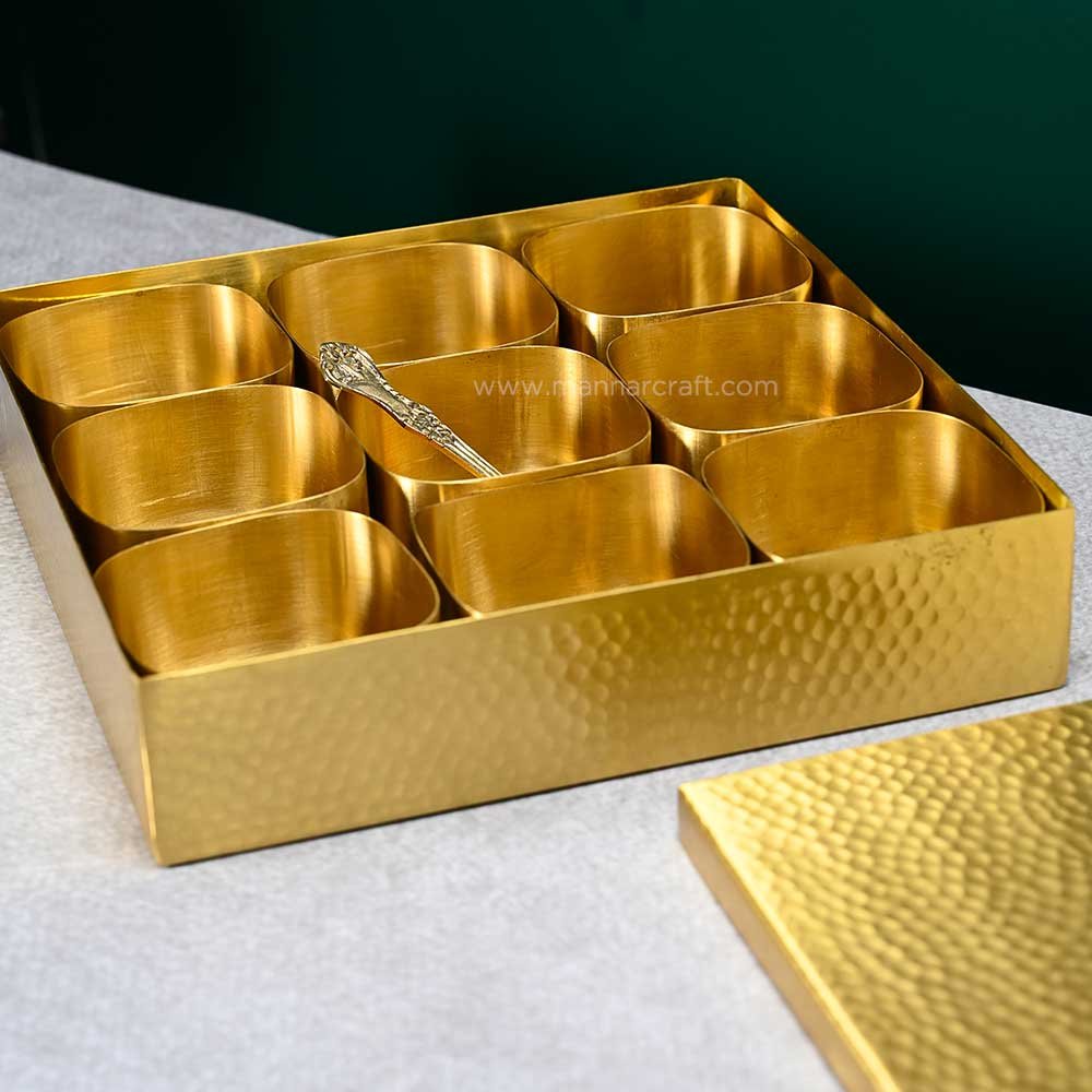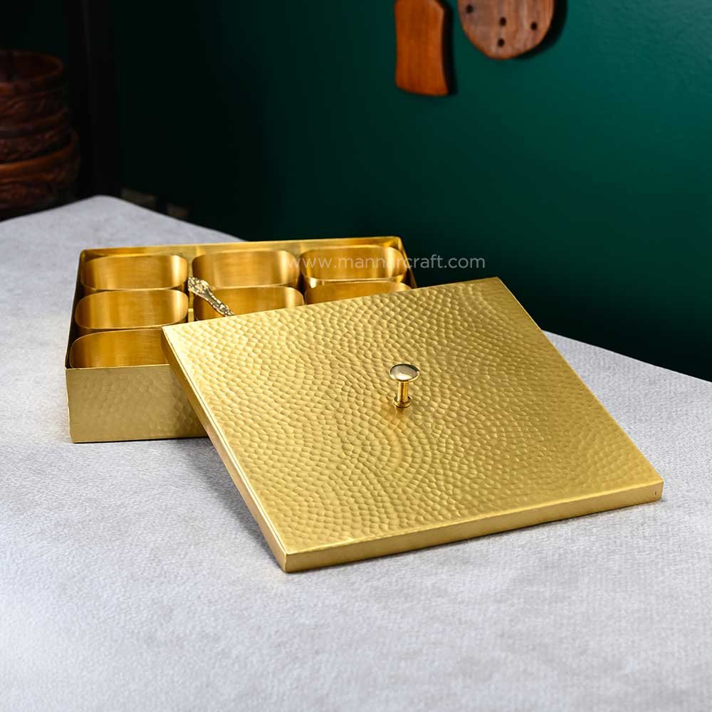 Organize your spices in style with this 8-inch Pure Brass Square Spice Box. Features 9 containers, an embossed lid, and a spoon – perfect for every Indian kitchen.