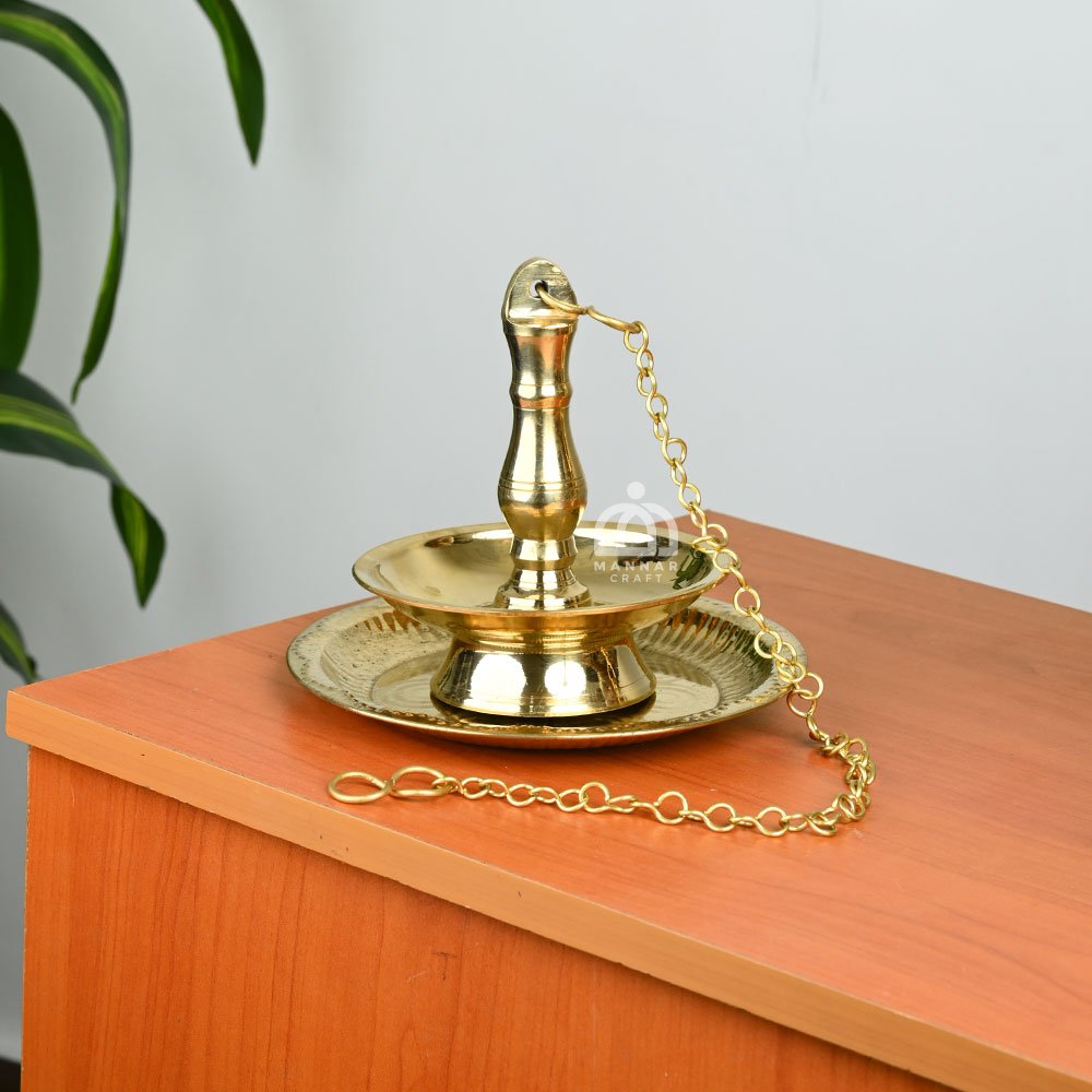 Bring traditional Kerala charm to your pooja room or temple with this Traditional Brass Thookuvilakku (hanging lamp), featuring a sturdy fixed brass plate for safe oil placement. Handcrafted by skilled artisans from high-quality brass.